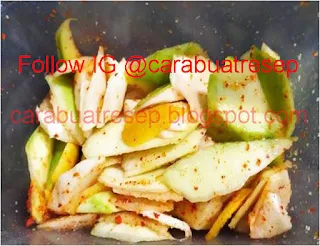 - Kupas mangga muda atau mangga mengkal, cuci bersih, potong potong setebal 1/2 cm.